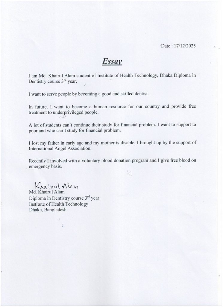 Hello, I’m Khairul. I’m 19 years old. I was admitted to Angel home in 2012. I’ve been a dentistry student at the Institute of Health Technology in Dhaka since 2023. WSO support is very essential for my studies. My future goal is working to support the poorest people. Thank you!