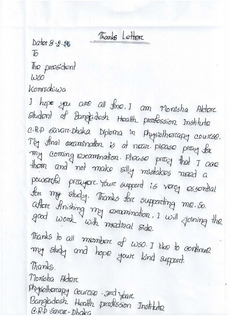 Monisha graduated from the Bangladesh Health Profession Institute, C.R.P., Dhaka, with a Diploma in Physiotherapy in 2025. She works as a much-needed physiotherapist at the Women & Children’s Hospital, Hemayetpur, Savar, Dhaka.