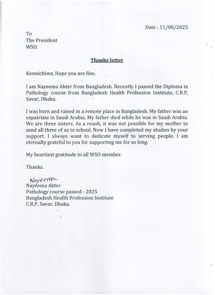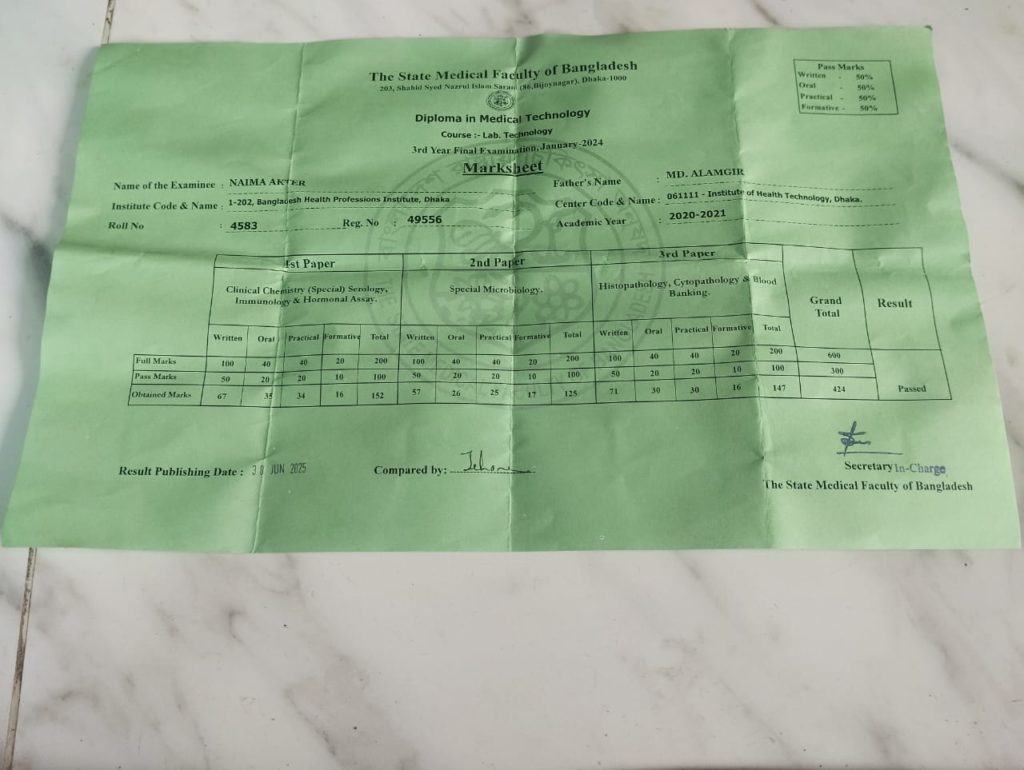 Nayeema graduated from the Bangladesh Health Profession Institute, C.R.P., Dhaka, with a Diploma in Pathology in 2025. She works as a much-needed pathologist at Romaisa General Hospital, Chandra, Gazipur.